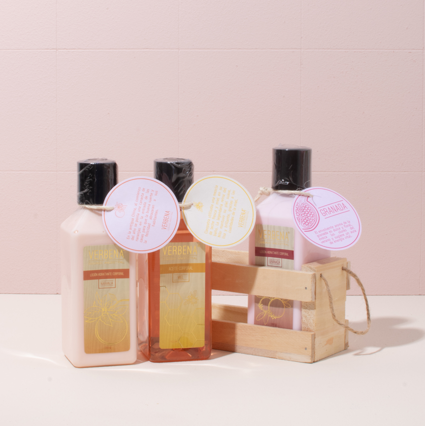 Este kit viene empacado en una caja de madera y contiene: 3 Lociones Hidratantes Corporales de 150 gramos cada una. Fragancias surtidas (Verbena, Miel, Naranja o Granada).