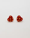 Aretes tipo topo con diseño de corazón y estrellas, elaborados con aleación de metales y baño de oro de 24k, finalizados con laca de alta resistencia, hecho en Medellín y pintados a mano en color rojo.
